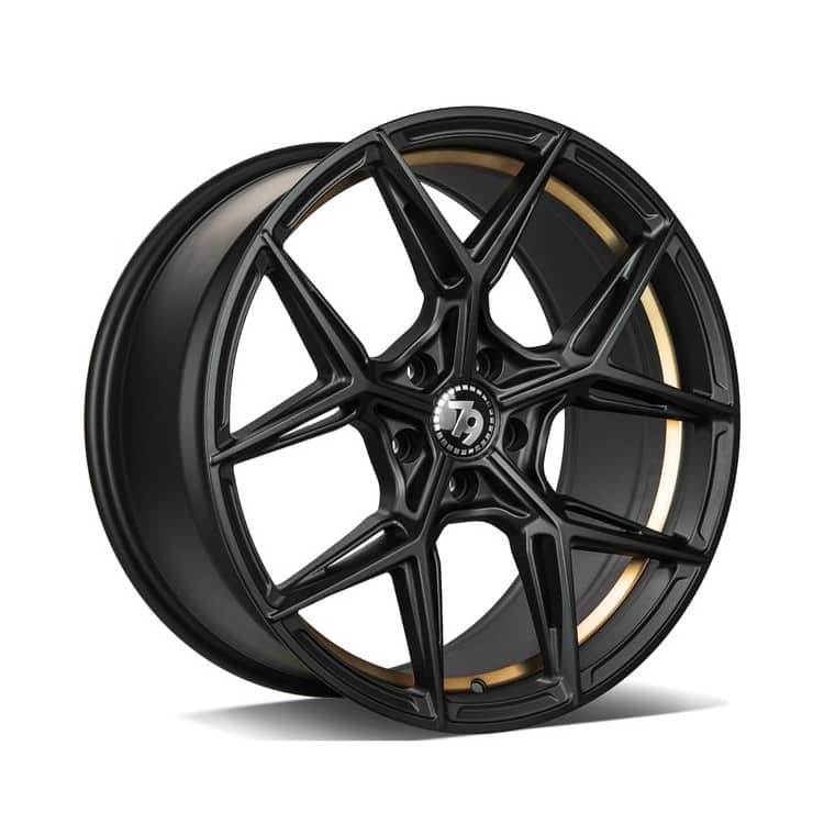 The 79Wheels SCF-B Matt Black Gold Barrel wheel is available in 5×112 and 5×120 5 stud PCD fitments.